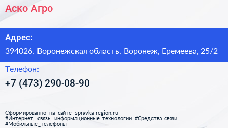 Аско-Агро по адресу 394026, Воронежская область, Воронеж, Еремеева, 25/2 в дальнейшем Организация, размещена в следующих категориях: