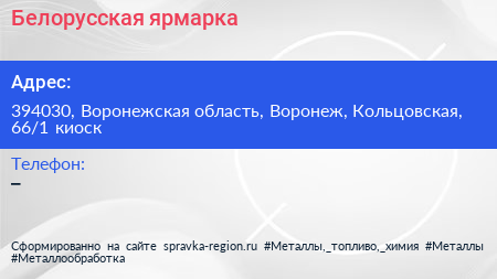 Белорусская ярмарка по адресу 394030, Воронежская область, Воронеж, Кольцовская, 66/1 киоск в дальнейшем Организация, размещена в следующих категориях: