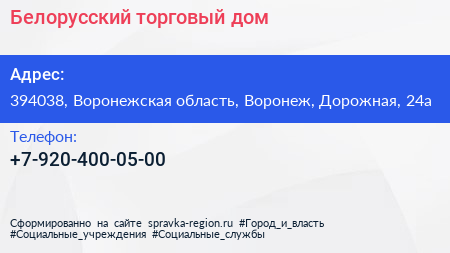 Белорусский, торговый дом по адресу 394038, Воронежская область, Воронеж, Дорожная, 24а в дальнейшем Организация, размещена в следующих категориях:
