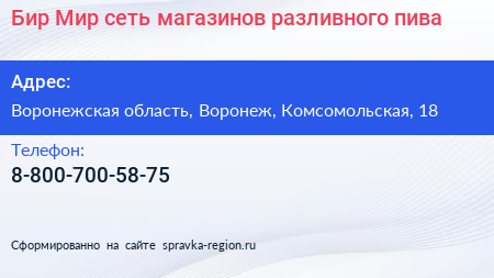 Бир Мир, сеть магазинов разливного пива по адресу Воронежская область, Воронеж, Комсомольская, 18 в дальнейшем Организация, размещена в следующих категориях: