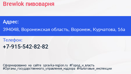 Brewlok, пивоварня по адресу 394048, Воронежская область, Воронеж, Курчатова, 16а в дальнейшем Организация, размещена в следующих категориях: