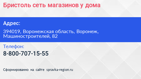 Бристоль, сеть магазинов у дома по адресу 394019, Воронежская область, Воронеж, Машиностроителей, 82 в дальнейшем Организация, размещена в следующих категориях:
