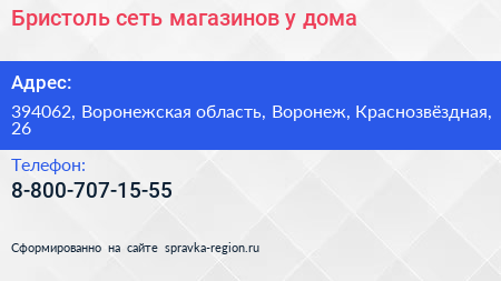 Бристоль, сеть магазинов у дома по адресу 394062, Воронежская область, Воронеж, Краснозвёздная, 26 в дальнейшем Организация, размещена в следующих категориях: