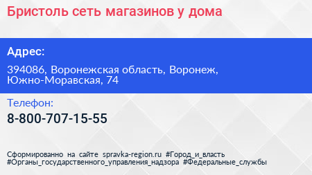 Бристоль, сеть магазинов у дома по адресу 394086, Воронежская область, Воронеж, Южно-Моравская, 74 в дальнейшем Организация, размещена в следующих категориях:
