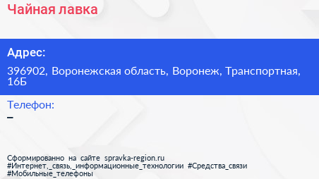 Чайная лавка по адресу 396902, Воронежская область, Воронеж, Транспортная, 16Б в дальнейшем Организация, размещена в следующих категориях: