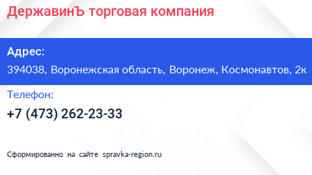 ДержавинЪ, торговая компания по адресу 394038, Воронежская область, Воронеж, Космонавтов, 2к в дальнейшем Организация, размещена в следующих категориях: