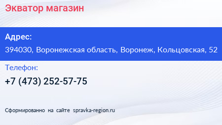 Экватор, магазин по адресу 394030, Воронежская область, Воронеж, Кольцовская, 52 в дальнейшем Организация, размещена в следующих категориях: