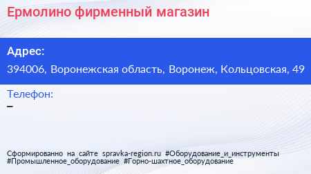Ермолино, фирменный магазин по адресу 394006, Воронежская область, Воронеж, Кольцовская, 49 в дальнейшем Организация, размещена в следующих категориях:
