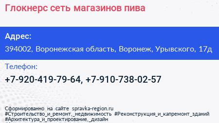 Глокнерс, сеть магазинов пива по адресу 394002, Воронежская область, Воронеж, Урывского, 17д в дальнейшем Организация, размещена в следующих категориях: