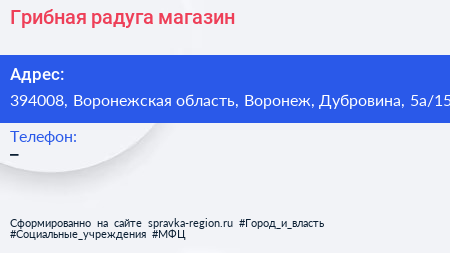 Грибная радуга, магазин по адресу 394008, Воронежская область, Воронеж, Дубровина, 5а/15 в дальнейшем Организация, размещена в следующих категориях: