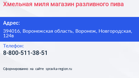 Хмельная миля, магазин разливного пива по адресу 394016, Воронежская область, Воронеж, Новгородская, 124в в дальнейшем Организация, размещена в следующих категориях: