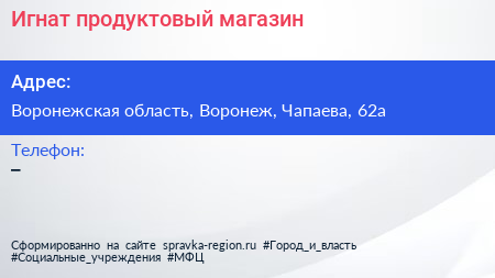 Игнат, продуктовый магазин по адресу Воронежская область, Воронеж, Чапаева, 62а в дальнейшем Организация, размещена в следующих категориях: