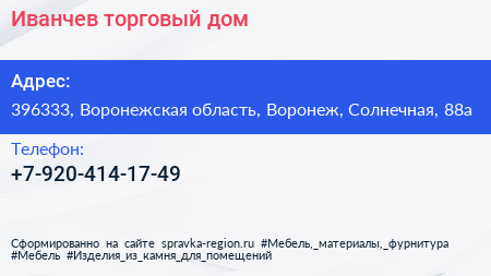 Иванчев, торговый дом по адресу 396333, Воронежская область, Воронеж, Солнечная, 88а в дальнейшем Организация, размещена в следующих категориях: