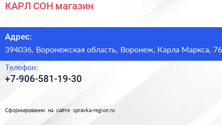 КАРЛ & СОН, магазин по адресу 394036, Воронежская область, Воронеж, Карла Маркса, 76 в дальнейшем Организация, размещена в следующих категориях: