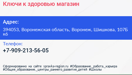 Ключи к здоровью, магазин по адресу 394053, Воронежская область, Воронеж, Шишкова, 107Б к6 в дальнейшем Организация, размещена в следующих категориях: