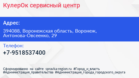 КулерОк, сервисный центр по адресу 394088, Воронежская область, Воронеж, Антонова-Овсеенко, 29 в дальнейшем Организация, размещена в следующих категориях: