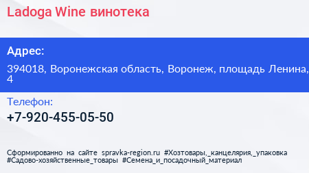 Ladoga Wine, винотека по адресу 394018, Воронежская область, Воронеж, площадь Ленина, 4 в дальнейшем Организация, размещена в следующих категориях: