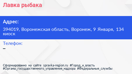 Лавка рыбака по адресу 394019, Воронежская область, Воронеж, 9 Января, 134 киоск в дальнейшем Организация, размещена в следующих категориях: