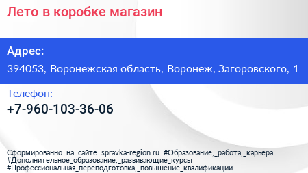 Лето в коробке, магазин по адресу 394053, Воронежская область, Воронеж, Загоровского, 1 в дальнейшем Организация, размещена в следующих категориях: