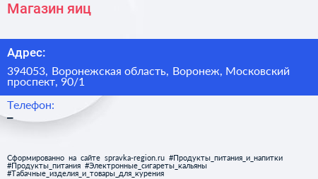 Магазин яиц по адресу 394053, Воронежская область, Воронеж, Московский проспект, 90/1 в дальнейшем Организация, размещена в следующих категориях: