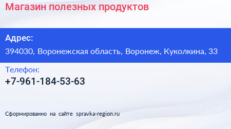 Магазин полезных продуктов по адресу 394030, Воронежская область, Воронеж, Куколкина, 33 в дальнейшем Организация, размещена в следующих категориях: