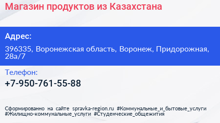 Магазин продуктов из Казахстана по адресу 396335, Воронежская область, Воронеж, Придорожная, 28а/7 в дальнейшем Организация, размещена в следующих категориях:
