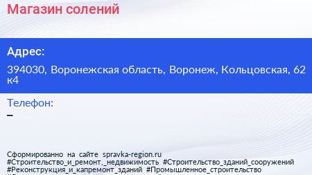 Магазин солений по адресу 394030, Воронежская область, Воронеж, Кольцовская, 62 к4 в дальнейшем Организация, размещена в следующих категориях: