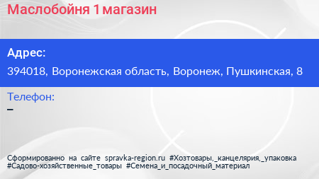 Маслобойня №1, магазин по адресу 394018, Воронежская область, Воронеж, Пушкинская, 8 в дальнейшем Организация, размещена в следующих категориях: