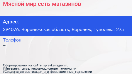 Мясной мир, сеть магазинов по адресу 394076, Воронежская область, Воронеж, Туполева, 27а в дальнейшем Организация, размещена в следующих категориях: