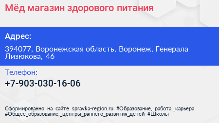 Мёд, магазин здорового питания по адресу 394077, Воронежская область, Воронеж, Генерала Лизюкова, 46 в дальнейшем Организация, размещена в следующих категориях:
