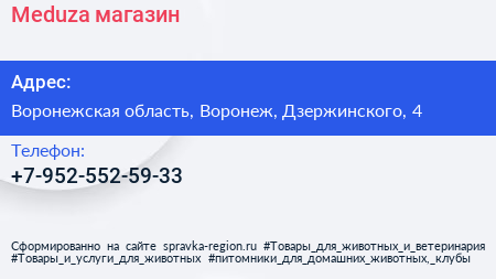 Meduza, магазин по адресу Воронежская область, Воронеж, Дзержинского, 4 в дальнейшем Организация, размещена в следующих категориях: