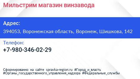 Мильстрим, магазин винзавода по адресу 394053, Воронежская область, Воронеж, Шишкова, 142 в дальнейшем Организация, размещена в следующих категориях: