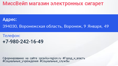 МиссВейп, магазин электронных сигарет по адресу 394030, Воронежская область, Воронеж, 9 Января, 49 в дальнейшем Организация, размещена в следующих категориях: