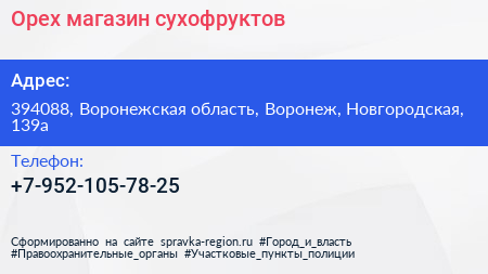 Орех, магазин сухофруктов по адресу 394088, Воронежская область, Воронеж, Новгородская, 139а в дальнейшем Организация, размещена в следующих категориях: