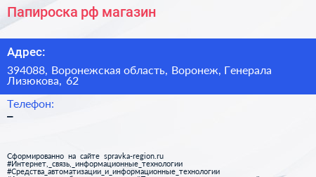 Папироска.рф, магазин по адресу 394088, Воронежская область, Воронеж, Генерала Лизюкова, 62 в дальнейшем Организация, размещена в следующих категориях: