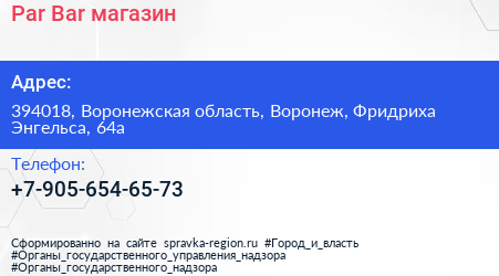 Par Bar, магазин по адресу 394018, Воронежская область, Воронеж, Фридриха Энгельса, 64а в дальнейшем Организация, размещена в следующих категориях: