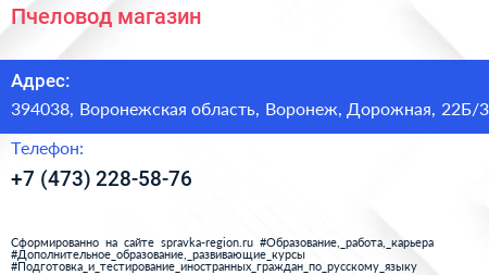 Пчеловод, магазин по адресу 394038, Воронежская область, Воронеж, Дорожная, 22Б/3 в дальнейшем Организация, размещена в следующих категориях: