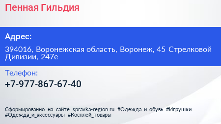 Пенная Гильдия по адресу 394016, Воронежская область, Воронеж, 45 Стрелковой Дивизии, 247е в дальнейшем Организация, размещена в следующих категориях: