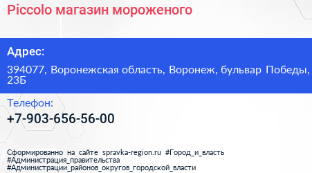 Piccolo, магазин мороженого по адресу 394077, Воронежская область, Воронеж, бульвар Победы, 23Б в дальнейшем Организация, размещена в следующих категориях: