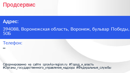 Продсервис по адресу 394088, Воронежская область, Воронеж, бульвар Победы, 50Б в дальнейшем Организация, размещена в следующих категориях: