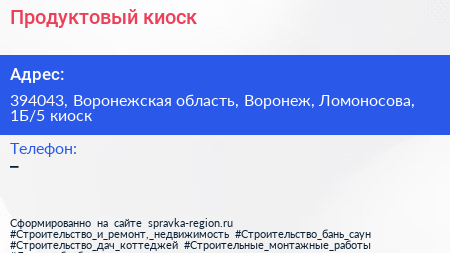 Продуктовый киоск по адресу 394043, Воронежская область, Воронеж, Ломоносова, 1Б/5 киоск в дальнейшем Организация, размещена в следующих категориях: