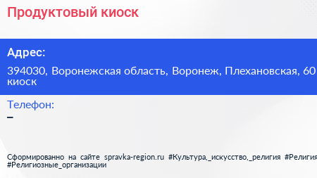 Продуктовый киоск по адресу 394030, Воронежская область, Воронеж, Плехановская, 60 киоск в дальнейшем Организация, размещена в следующих категориях: