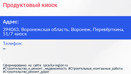 Продуктовый киоск по адресу 394063, Воронежская область, Воронеж, Перевёрткина, 51/7 киоск в дальнейшем Организация, размещена в следующих категориях: