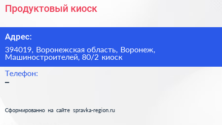 Продуктовый киоск по адресу 394019, Воронежская область, Воронеж, Машиностроителей, 80/2 киоск в дальнейшем Организация, размещена в следующих категориях: