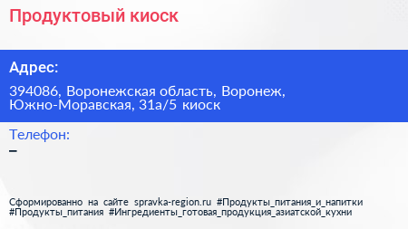 Продуктовый киоск по адресу 394086, Воронежская область, Воронеж, Южно-Моравская, 31а/5 киоск в дальнейшем Организация, размещена в следующих категориях: