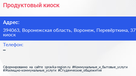 Продуктовый киоск по адресу 394063, Воронежская область, Воронеж, Перевёрткина, 37 киоск в дальнейшем Организация, размещена в следующих категориях: