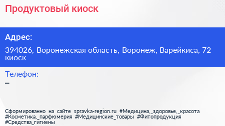 Продуктовый киоск по адресу 394026, Воронежская область, Воронеж, Варейкиса, 72 киоск в дальнейшем Организация, размещена в следующих категориях: