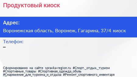 Продуктовый киоск по адресу Воронежская область, Воронеж, Гагарина, 37/4 киоск в дальнейшем Организация, размещена в следующих категориях: