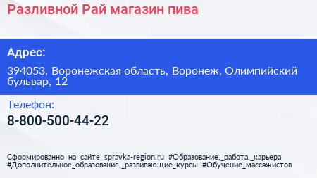 Разливной Рай, магазин пива по адресу 394053, Воронежская область, Воронеж, Олимпийский бульвар, 12 в дальнейшем Организация, размещена в следующих категориях: