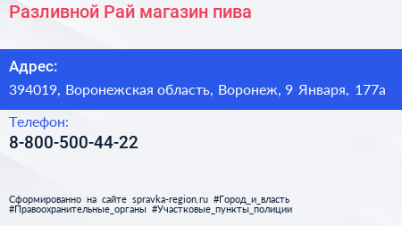 Разливной Рай, магазин пива по адресу 394019, Воронежская область, Воронеж, 9 Января, 177а в дальнейшем Организация, размещена в следующих категориях:
